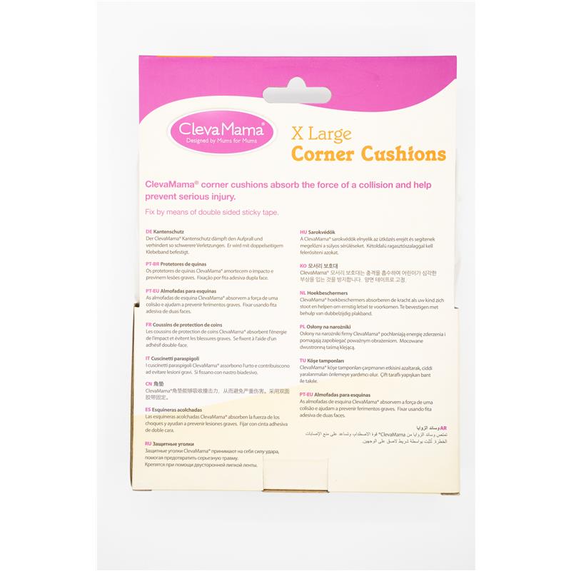 Clevamama X-Large Corner Cushions will hrlp to protect you child from the impact of a fall or knock agasint any sharp corners. The cushion will by absorb the force of a collision and help prevent serious injury. Fire retardant, non-toxic. BPA-free. Phthalate-free.