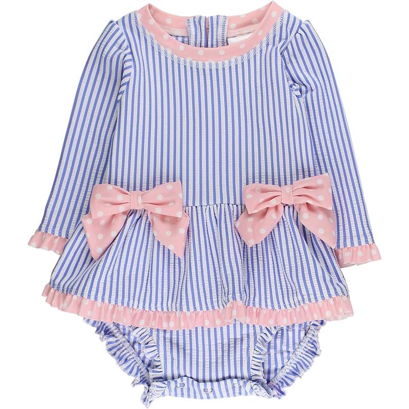 Rufflebutts Girls Periwinkle Blue Seersucker Long Sleeve One Piece Bow Peplum Rash Guard Swimsuit
