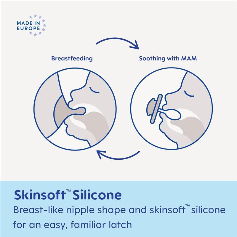 BICO DE SILICONE: A chupeta de silicone para meninos e meninas sem BPA tem o design exclusivo da MAM, com material SkinSoft sedoso e formato simétrico ideal para o desenvolvimento da mandíbula e dos dentes.