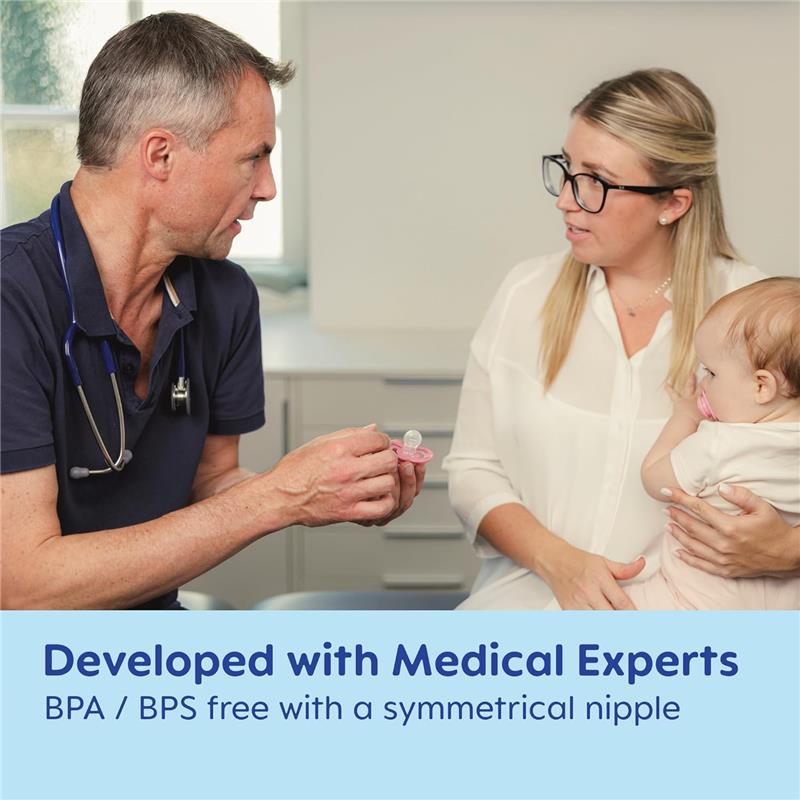FORMA SIMÉTRICA: Nenhuma chupeta de silicone “lado direito para cima” para bebês é descomplicada e não precisa ser ajustada para caber corretamente na boca do bebê e se ajusta perfeitamente sob o nariz para facilitar a respiração.