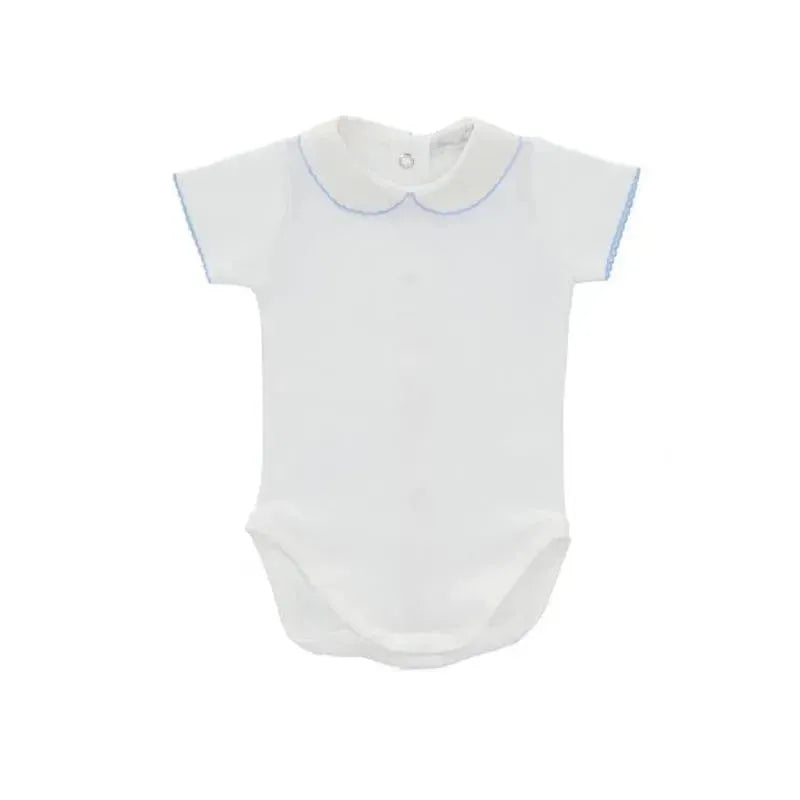 Um básico que poderia destacar qualquer look. Confeccionada em algodão macio, especial para peles delicadas. Este body branco clássico apresenta um bordado azul contrastante na gola e nas mangas. Possui botões em toda a parte de trás e entre as pernas para facilitar o vestir e a troca.