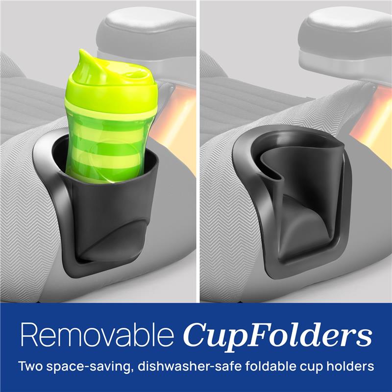 Two soft-sided CupFolders™ easily flex and fold out of the way to save space. For parent convenience, the cup holders are easy to remove and dishwasher-safe. All fabrics are also removable and machine-washable, including the pop-out arm rest covers.