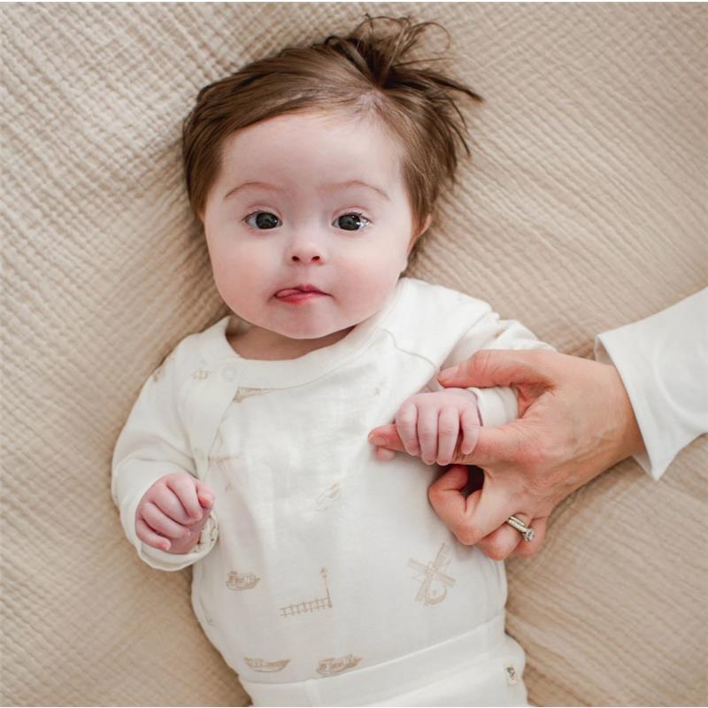 Snap opening along the side of Amsterdam print bodysuit, at left shoulder on printed stripe bodysuit, and at diaper line for easy dressing