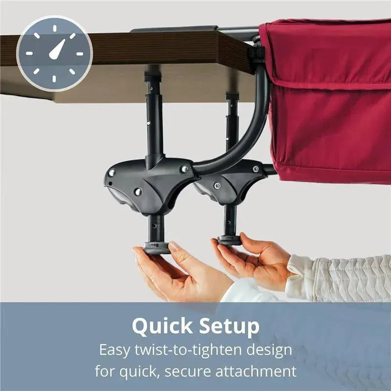 A cadeira alta acoplável para mesa possui suporte acolchoado com encosto alto e um arnês de três pontos para uma área de assento confortável e segura. Um design fácil de torcer para apertar facilita a fixação segura em mesas de 0,75 a 1,5 polegadas de espessura e com uma saia de até 5,5 polegadas.