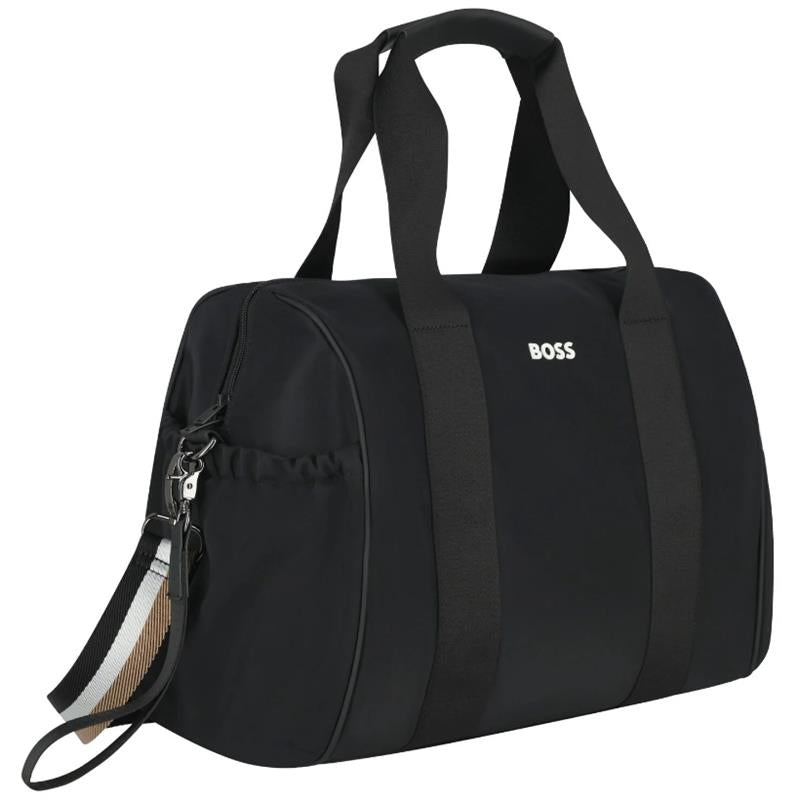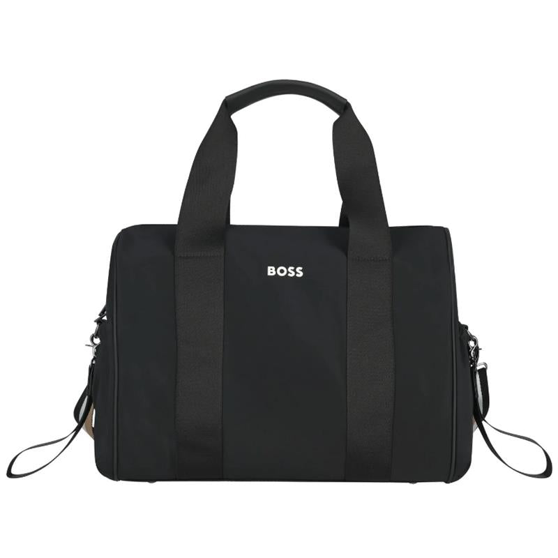 Black mommy bag by BOSS. Made from silky polyester, this stylish bag showcases the brands logo print on the front. The spacious main compartment fastens with a zip and includes interior pockets for organizing baby essentials. It comes with a detachable adjustable shoulder strap, removable stroller straps, and two carry handles for versatile use. A matching changing mat and fabric storage bag are included, making it the ideal accessory for parents on the go.