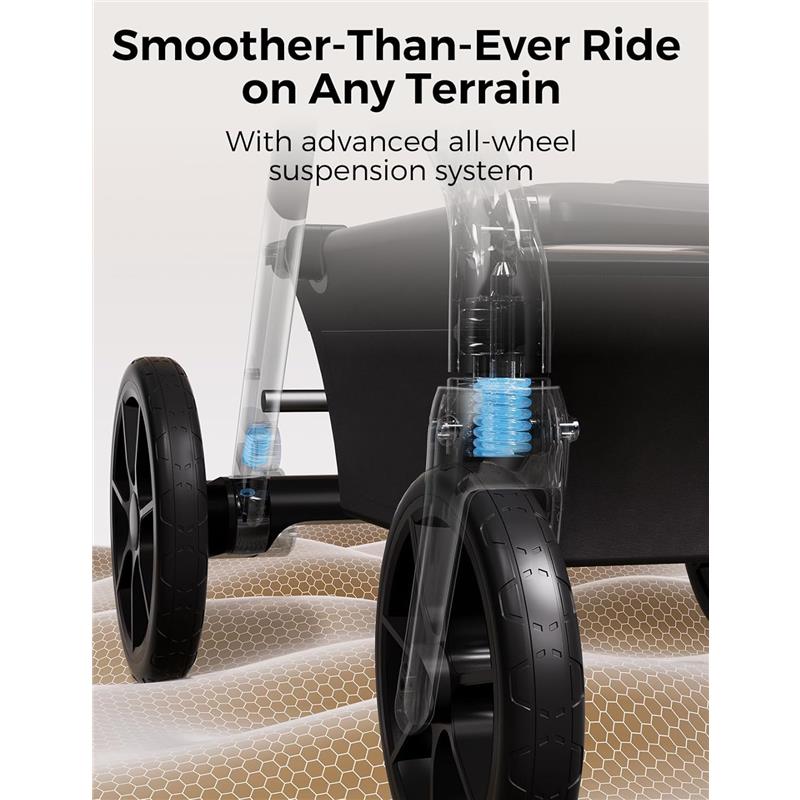 No worries about waking baby on bumpy surfaces or over curbs thanks to the large 10-inch front swivel wheels, 12-inch rear wheels, and advanced suspension system with high-performance, shock-absorbing springs