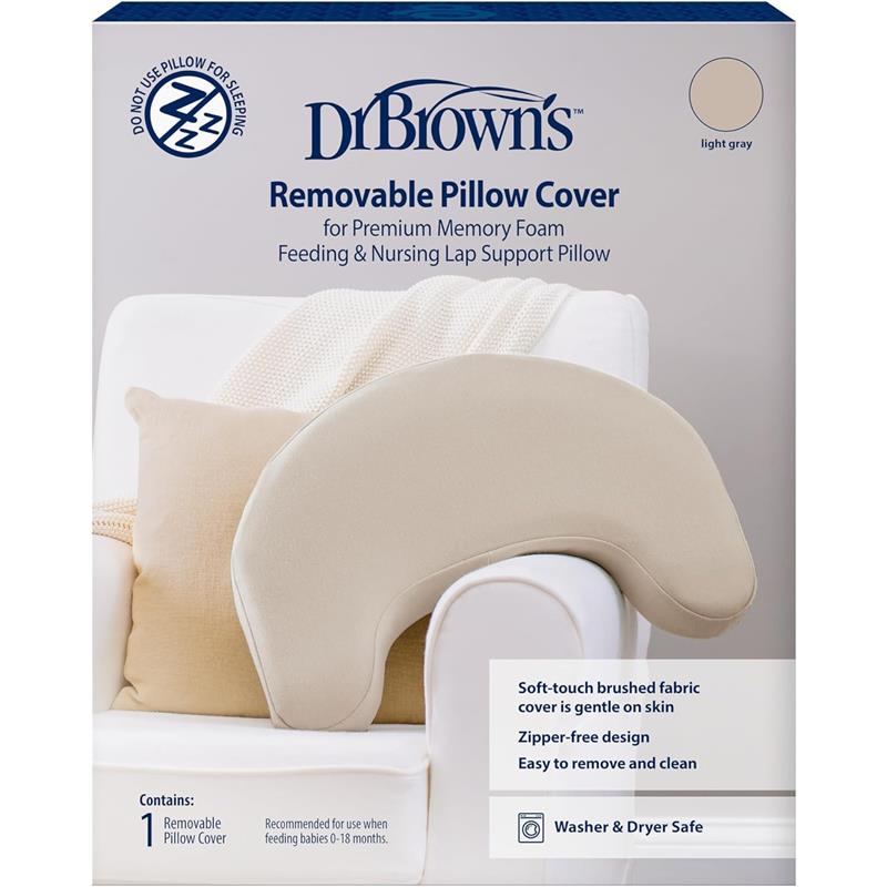 Dr. Brown's Feeding and Nursing Lap Support Pillow Cover is made for comfort for both parent and baby. The cover is made to protect the pillow from spills and spit-ups, and is uniquely designed to fit the Feeding and Nursing Lap Support Pillow. The brushed fabric pillow cover is soft and gentle on sensitive skin and is washer and dryer safe for easy cleaning. The zipper-free design is comfortable and lets you easily slide the cover on and off the pillow – and there are no parts that can break or scratch. Available in three stylish colors: gentle beige, light gray, and storm green. Perfect for replacing a lost or damaged cover, having an extra available, or just to have every color! WARNING: Read all instructions before using this product. Keep instructions for future use. Do not use if product is damaged. Never use feeding pillow without pillow cover. Always sit with pillow in lap to support baby safely. Do not allow baby to be supported only by pillow. Adult supervision is always required. Do not use for sleep. Do not use in sleep products like cribs, bassinets, or play yards. BABIES HAVE DIED USING NURSING PILLOWS FOR SLEEP OR LOUNGING. Babies can move without warning and CAN SUFFOCATE within minutes if their airway is blocked. Only use this product to feed baby. Move baby to an infant sleep product, like a crib or bassinet, if baby falls asleep or if you feel drowsy. Do not use pillow for sleeping. Never leave or prop up baby alone on this product. Never place this product where baby sleeps. Keep away from source of heat or open flame. Babies have been injured from FALLS. Do not use to prop up baby on beds, sofas, or other raised surfaces. Do not use to carry baby.