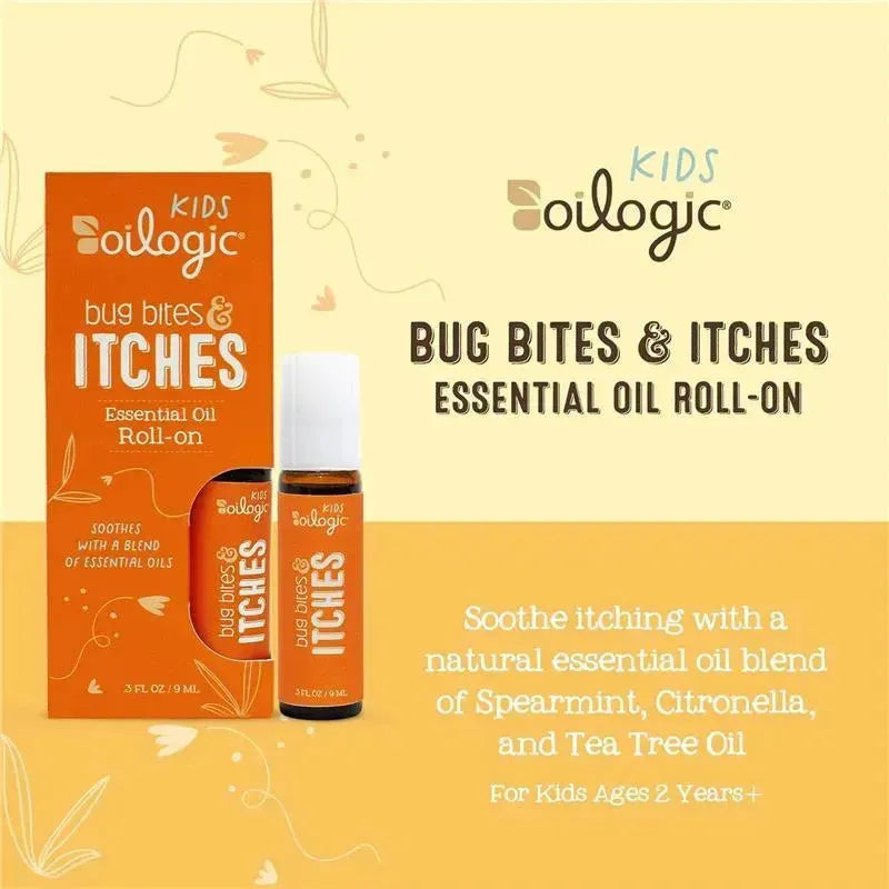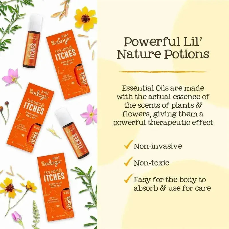 Óleos essenciais puros: Bug Bites & Itches Roll-on é feito com uma mistura concentrada de óleos de hortelã, citronela, tea tree, lavandina, camomila e limão. Esta mistura de óleos essenciais puros é diluída adequadamente com óleos de jojoba e rícino para aplicações tópicas.