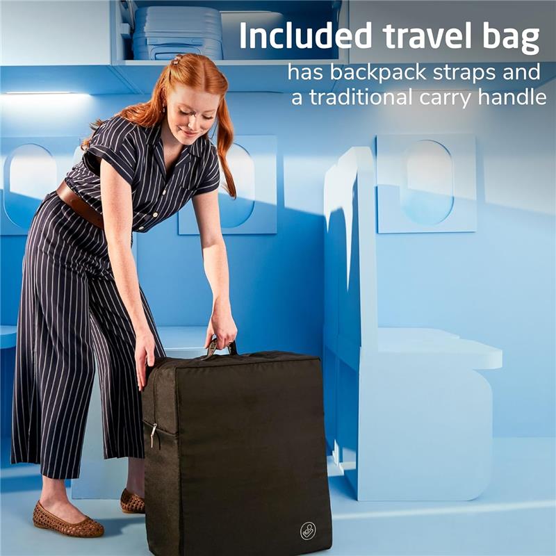 The Maxi Cosi Oxford Cabin Lightweight Travel Stroller makes every journey easier. Designed for travel-ready convenience, it features a 1-hand ultra-compact fold that is IATA-compliant, so it fits in most airplane and train overhead compartments, perfect for vacations or quick trips. Weighing only 16 lbs., it’s easy to carry using the included travel bag with backpack straps. With a smooth all-wheel suspension, adjustable recline, comfortable leg rest, and breathable EcoCare fabrics, your child enjoys a relaxing ride up to 50 lbs. Stylish vegan-leather accents and practical storage make this stroller your go-to companion for everyday adventures.