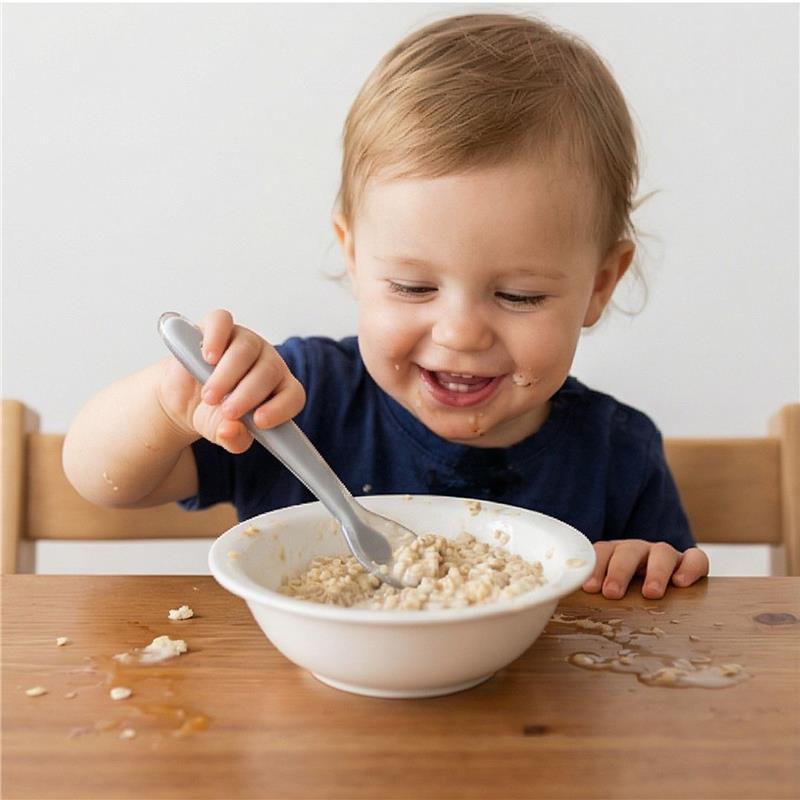 CABO LONGO E ERGONÔMICO: pega fácil e confortável para as mãos do bebê, mas também fácil de manusear pelos pais. É longo o suficiente para alcançar o fundo da maioria dos potes para bebês.