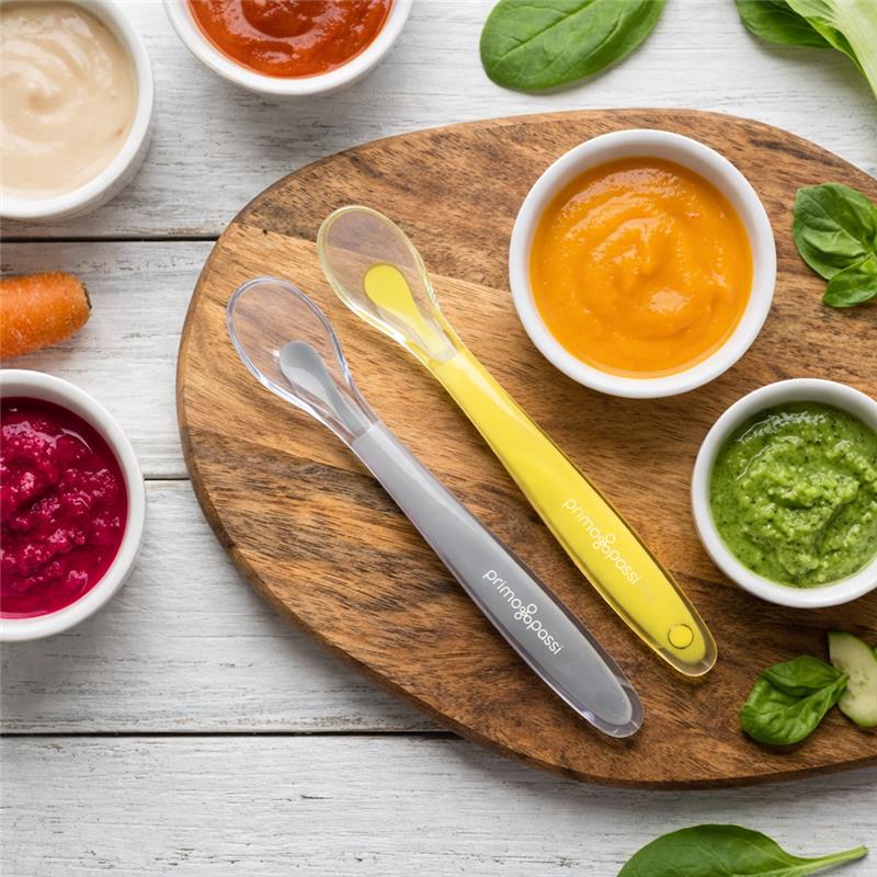 As colheres de silicone Primo Passi 4Pack são colheres de silicone de primeira etapa projetadas para promover independência e segurança para bebês que estão sendo introduzidos a alimentos sólidos. A alça longa e ergonômica também é adequada para as mãos dos adultos, para que os pais possam alimentar seus filhos com conforto. Eles são confortáveis de segurar e têm o comprimento certo para alcançar o fundo da maioria dos potes de comida para bebê. Macio e flexível! Foi projetado com formato redondo com silicone ultramacio de qualidade alimentar, suave o suficiente para as gengivas sensíveis do bebê.