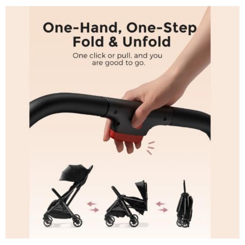 The ClickGo is designed with a one-hand, one-step fold and unfold. Click the button at the handlebar and the stroller folds itself and stands on its own. With a quick pull, it opens smoothly.