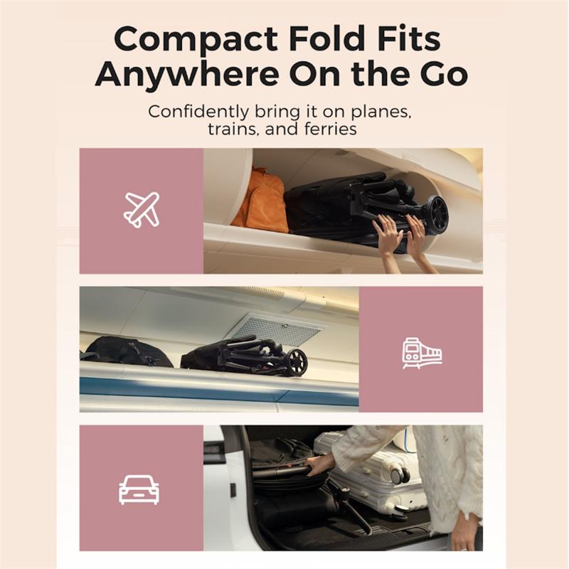 When folded, this compact stroller easily fits into the trunk of your car and overhead bin of a plane (confirm with airline for specific carry-on requirements).