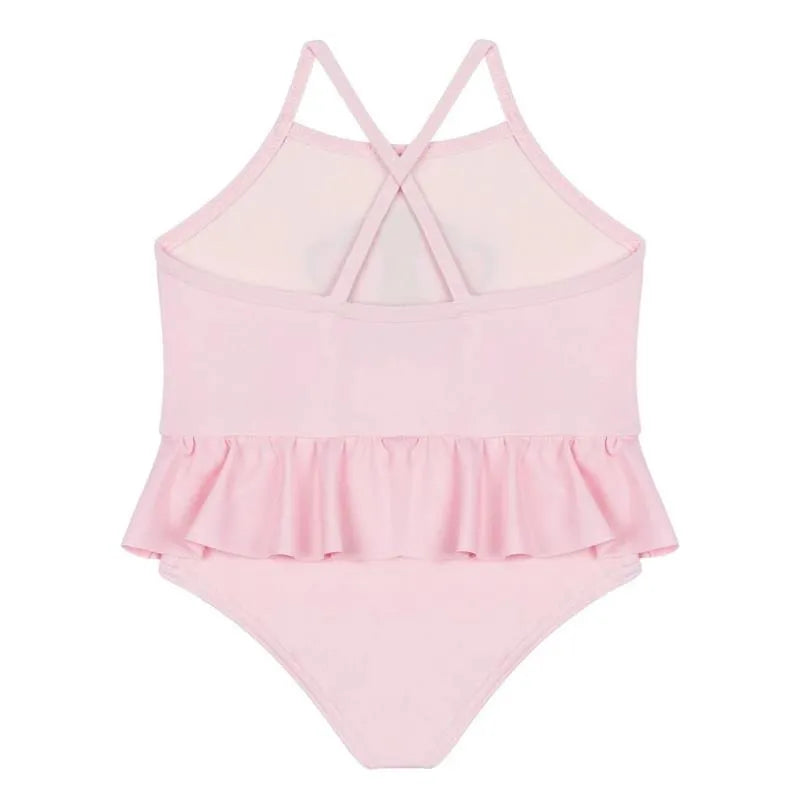 Light Pink one-piece swimsuit with braided straps on the back and ruffles on the waist. It is embellished with Teddy Bear with heart and black logo on the front. 77% Polyester. 23% Elastan. Machine wash at 30°C.