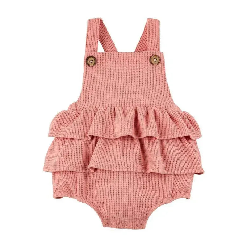 Bolha de babados em malha waffle com alças de botão de madeira de coco. A parte interna da perna se encaixa.