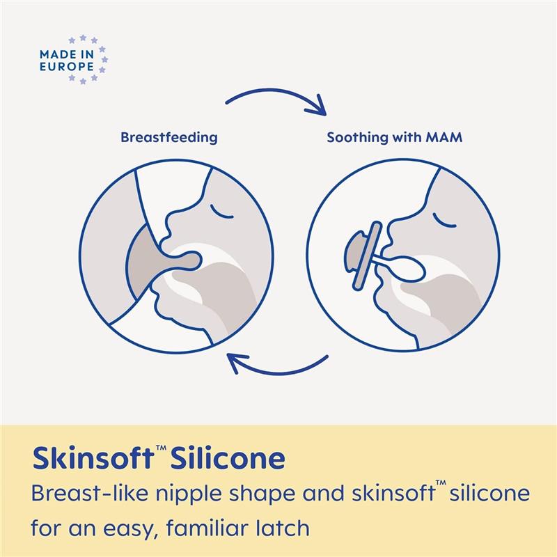 O design premiado da chupeta de ar MAM livre de BPA apresenta o escudo mais leve da MAM. Desenvolvidas pelos principais dentistas pediátricos e psicólogos do desenvolvimento para proporcionar o máximo conforto e estilo para bebês com mais de seis meses de idade, as chupetas de última geração da MAM combinam inovação tecnológica e design de tendências para ajudar a dar aos bebês um começo de vida saudável.