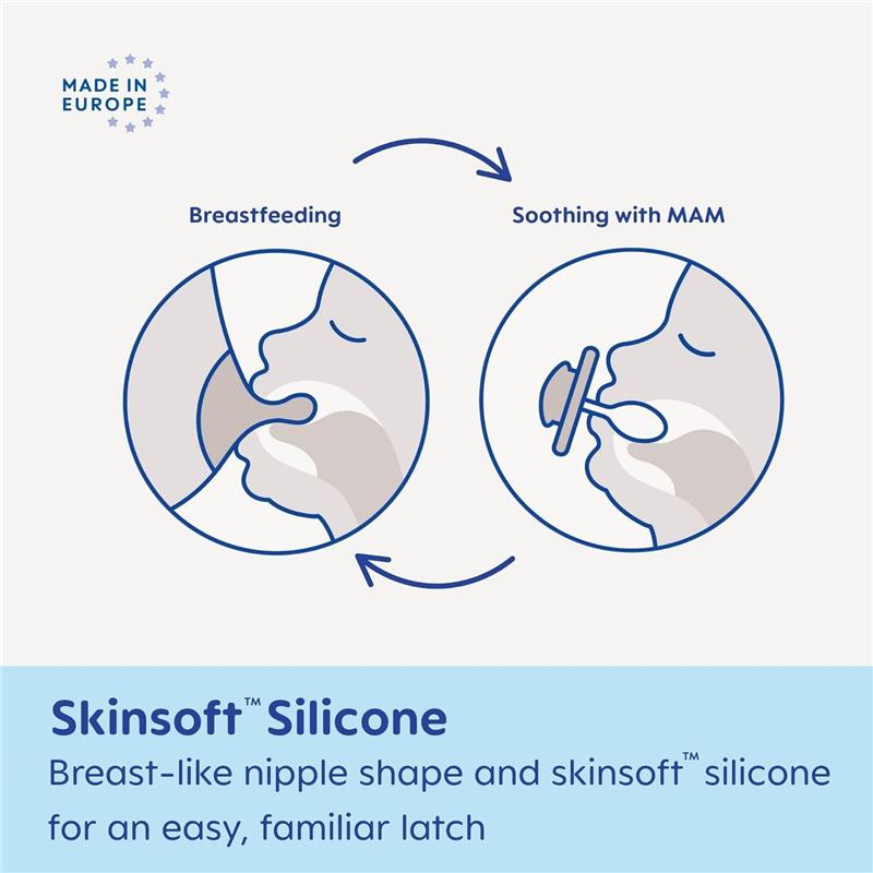 O mamilo de silicone ultra macio MAM fica confortavelmente na boca do bebê devido à textura antiderrapante