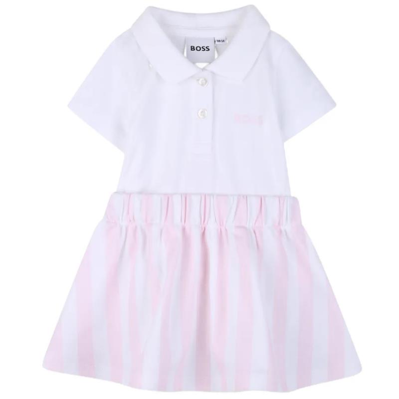 Add a sporty-chic touch to your little one’s wardrobe with this BOSS Kidswear striped dress. Designed with a classic polo collar and soft pink stripes, this piece combines casual comfort with the elevated style the BOSS brand is known for.