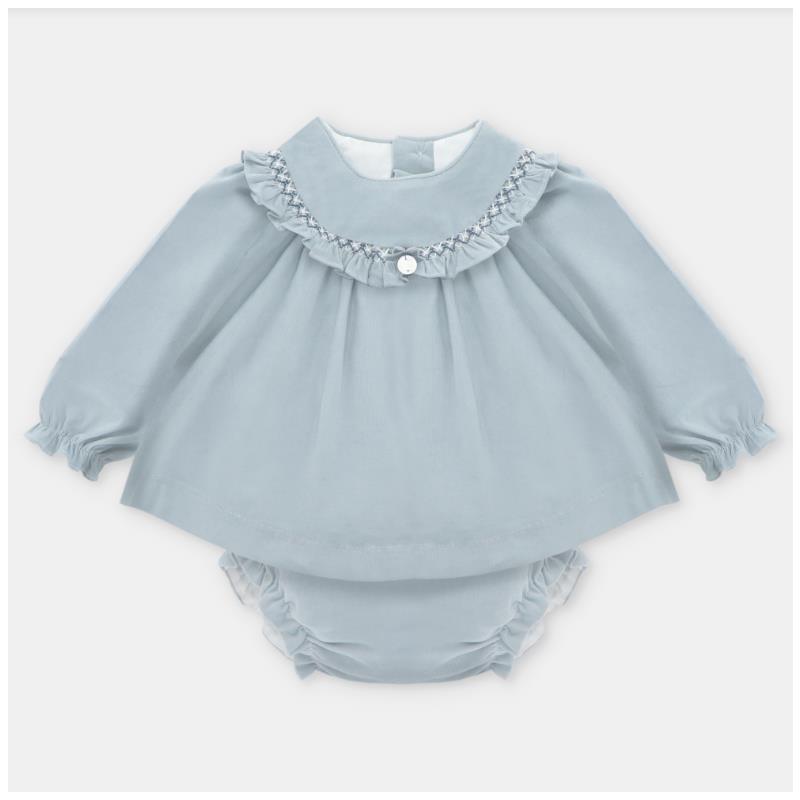 The Sheffield dress and matching bloomer set by Martin Aranda offers effortless style and comfort for your little one. In a soft blue-grey hue, this set features delicate details and a timeless design, perfect for everyday wear or special occasions. Crafted from lightweight, breathable fabrics, it ensures ease of movement while keeping your baby beautifully dressed. A versatile and elegant addition to any baby wardrobe.