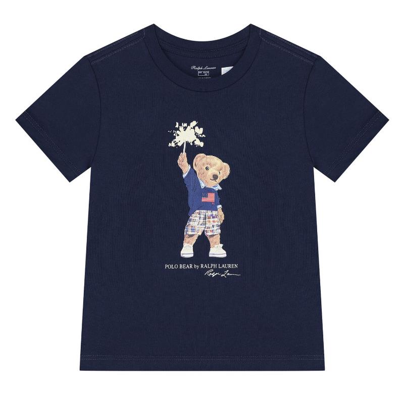 Navy blue t-shirt for baby and younger boys by iconic brand Ralph Lauren. Made from soft cotton jersey, it features the brands iconic Polo Bear print on the front. Fastens with poppers on one shoulder for easy dressing.