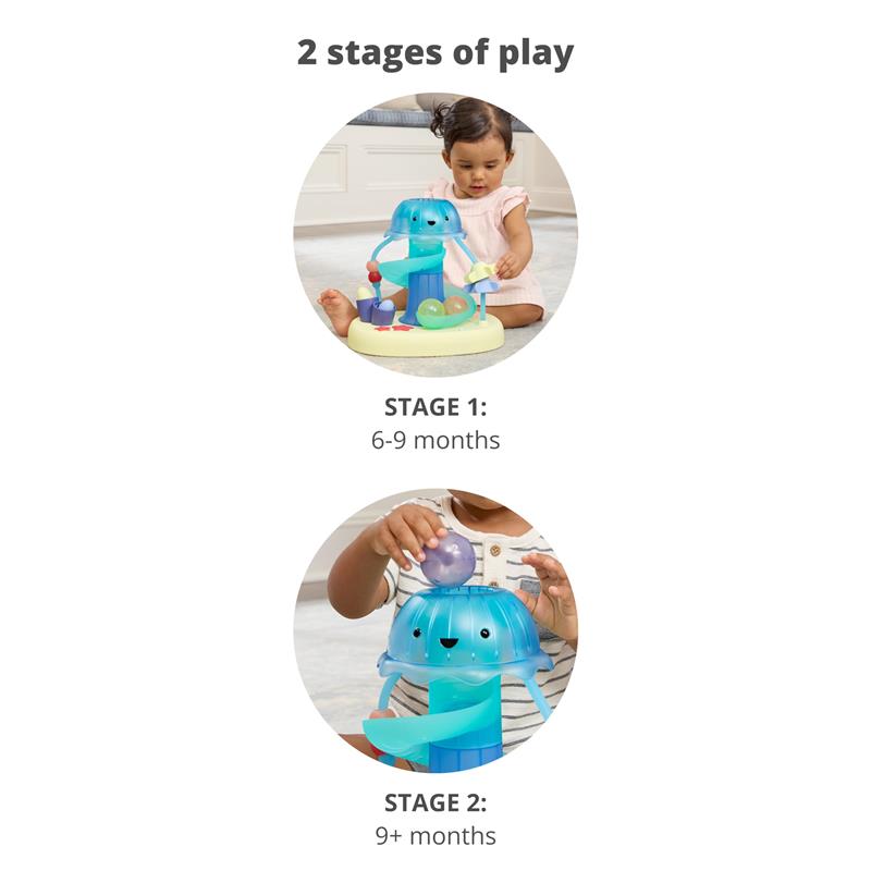 For babies aged 6-9 months, Stage 1 introduces a sensory adventure with charming jellyfish spinners, a captivating tentacle bead mover, and seesaw eels. As your child continues to grow, Stage 2 (for babies aged 9 months and above) entertains with the thrill of dropping pufferfish balls down a spiral slide - unleashing a spectacular display of lights, music, and sound effects.
