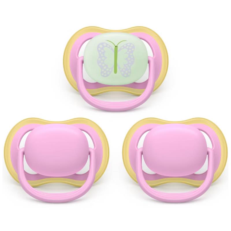 Avent 3Pk Ultra Air Pacifier 6-18M, Quiet Pink/Butterfly, Day+Night