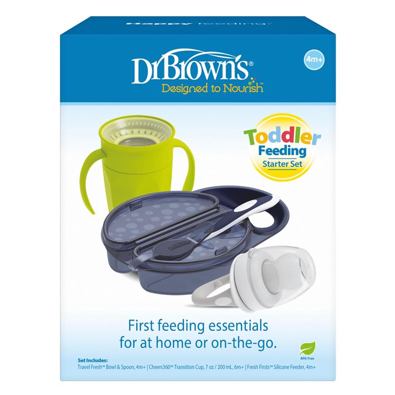 This essential feeding set includes 1 Travel Fresh Bowl and Spoon (4m+), 1 Cheers360 Spoutless Training Cup with Handles (6m+), and 1 Fresh Firsts Silicone Feeder (4m+). Your child's mealtime on-the-run just got a lot easier and cleaner with Dr. Brown's Toddler Feeding Starter Set.