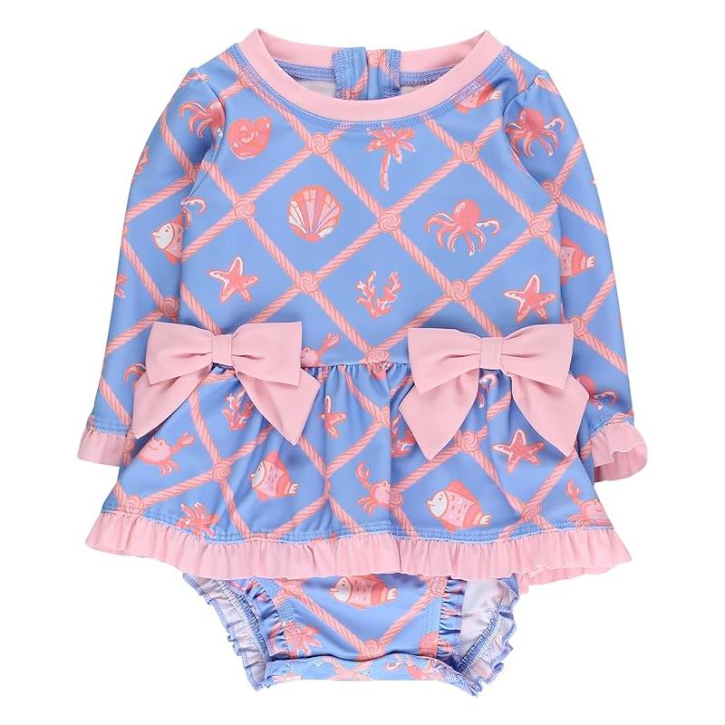 Rufflebutts Girls Tropical Trellis Long Sleeve One Piece Bow Peplum Rash Guard With Zipper