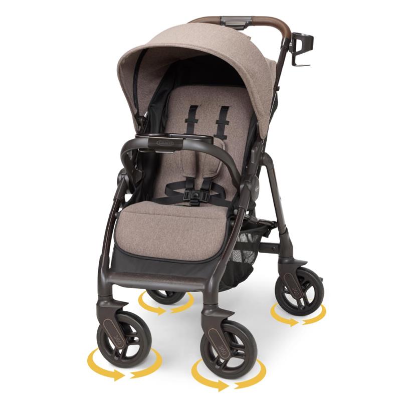 The Graco Merge Stroller is thoughtfully designed to move with you, so you feel confident, connected, and in control every step of the way. With the push of a button, all 4 wheels rotate 360° to glide smoothly in any direction, making tight corners, crowded spaces, and tricky turns feel completely seamless. The smooth experience continues with the Graco signature FastAction fold, which provides a one-second, one-hand fold for parents on-the-go. Its durable steel frame, plush seat fabrics, and a high-quality knit canopy are made to go the distance from your first stroll together through your everyday routines. A convertible 3- or 5-point no-rethread harness, one-hand reclining seat, and removable child's tray help keep your little one safe and comfortable. Plus, thoughtful touches like a leatherette handle, parent cup holder, and ample storage make every outing feel effortless.